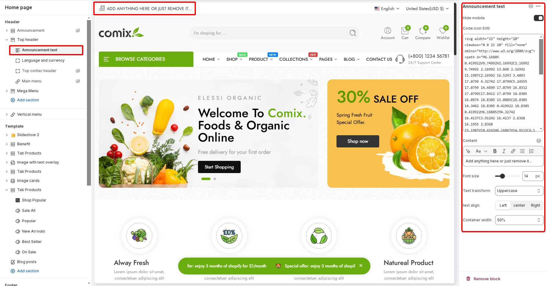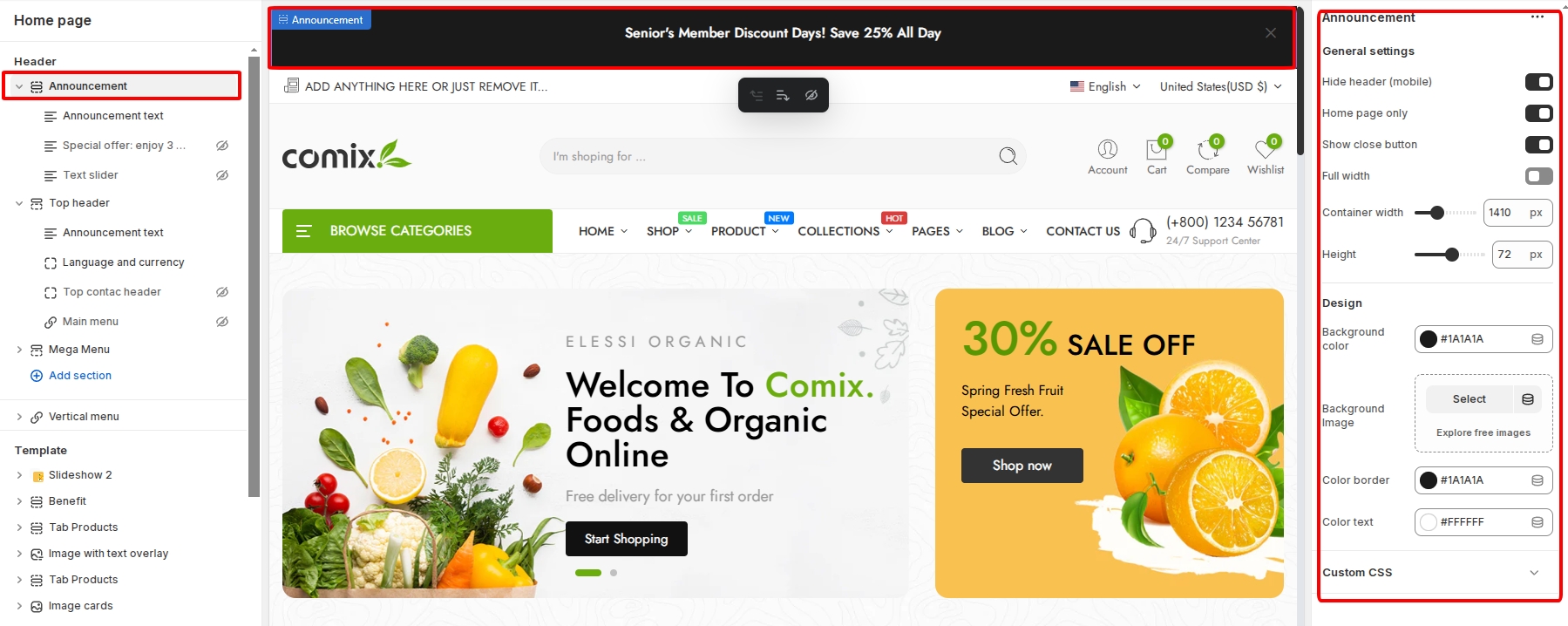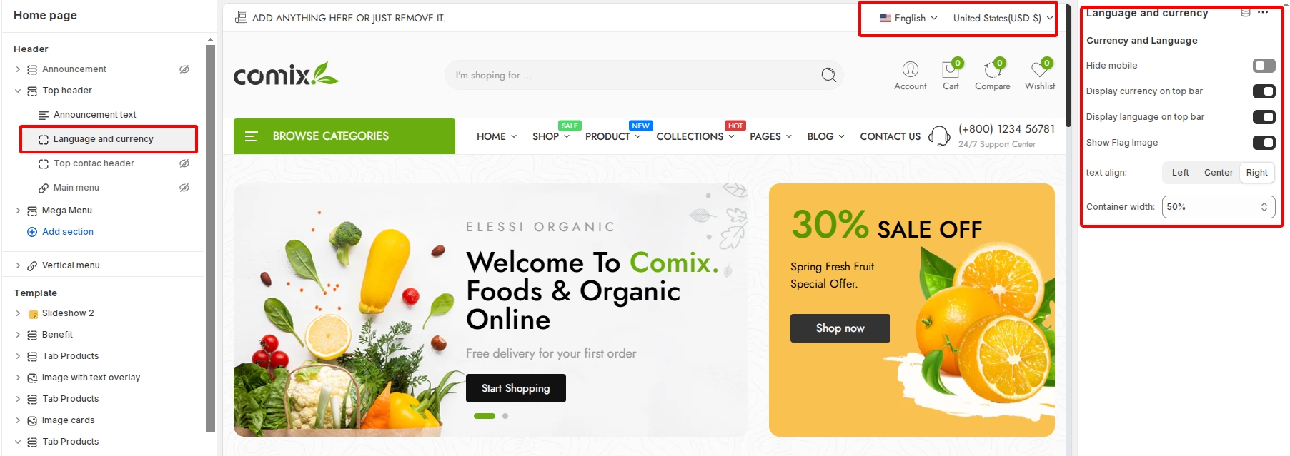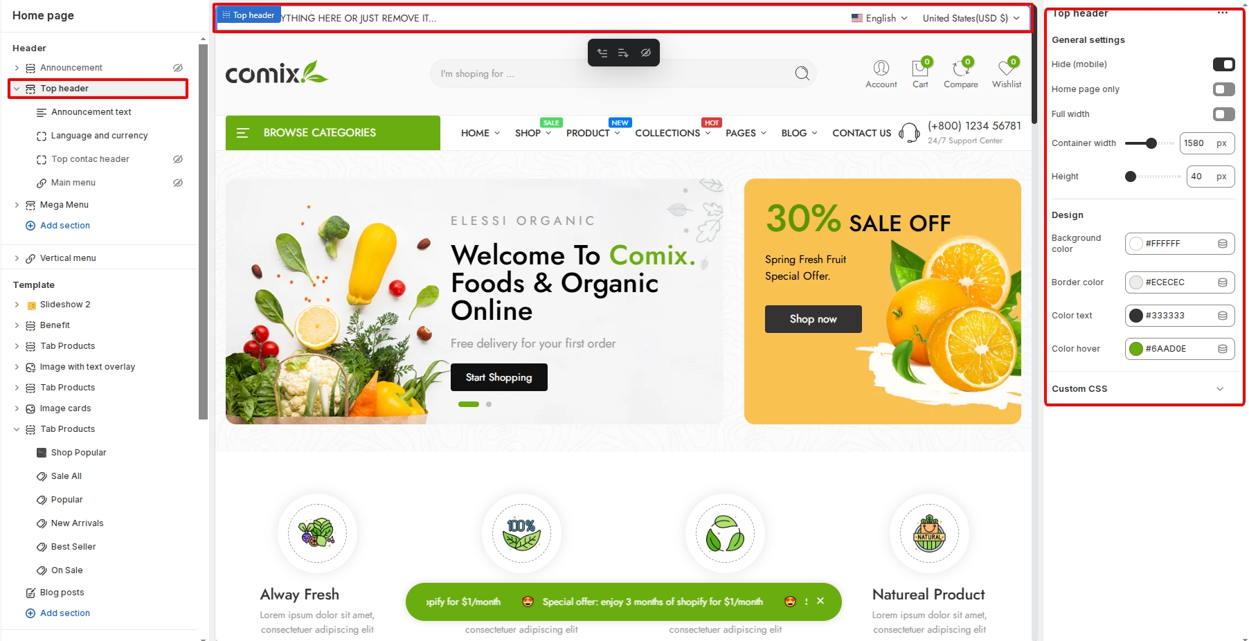 From Admin>>Theme>>Top header and setting on the right. You can Turn ON or OFF the top header, currency, language, account. Also you can change the color, background, Social settings.