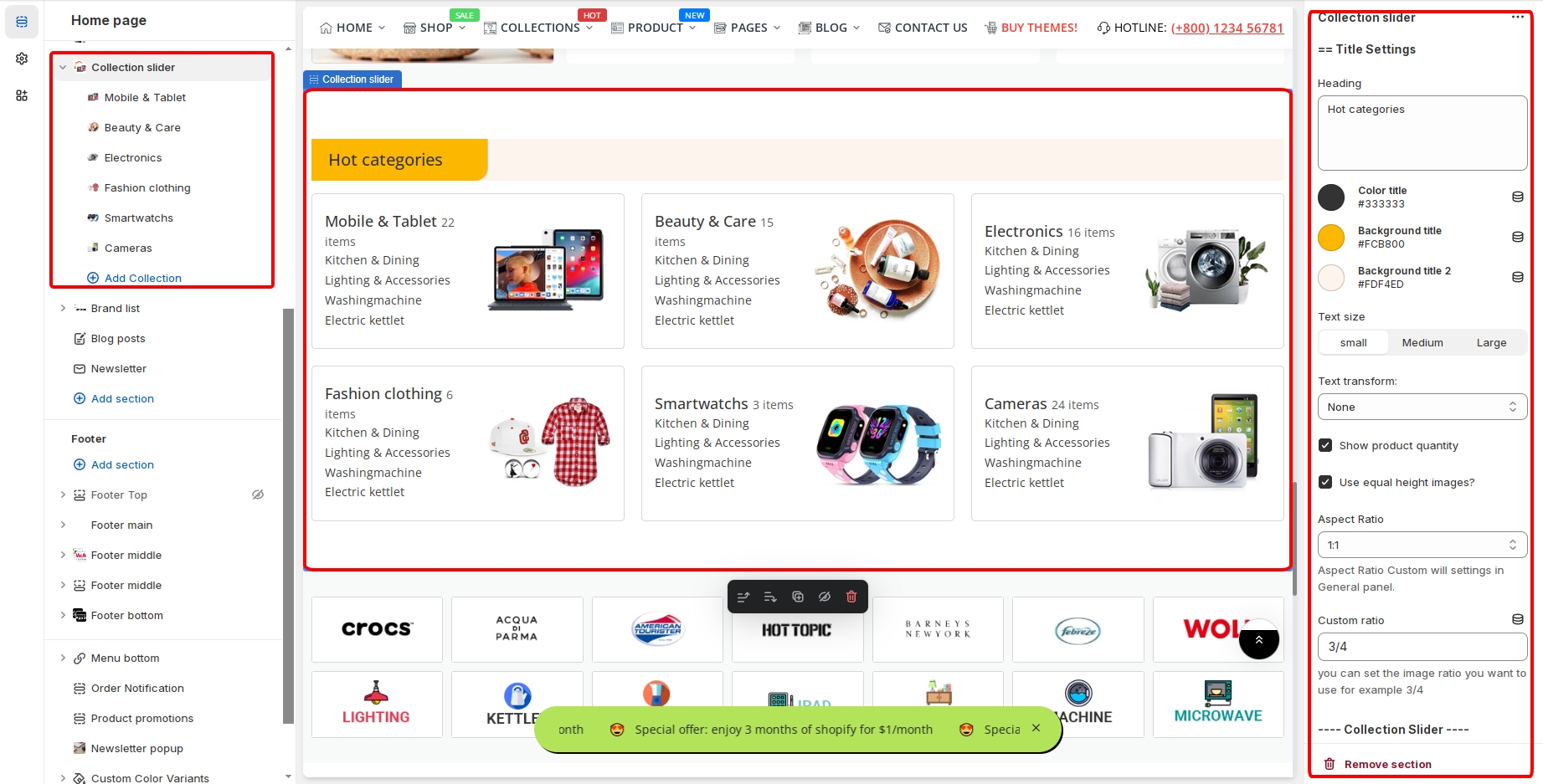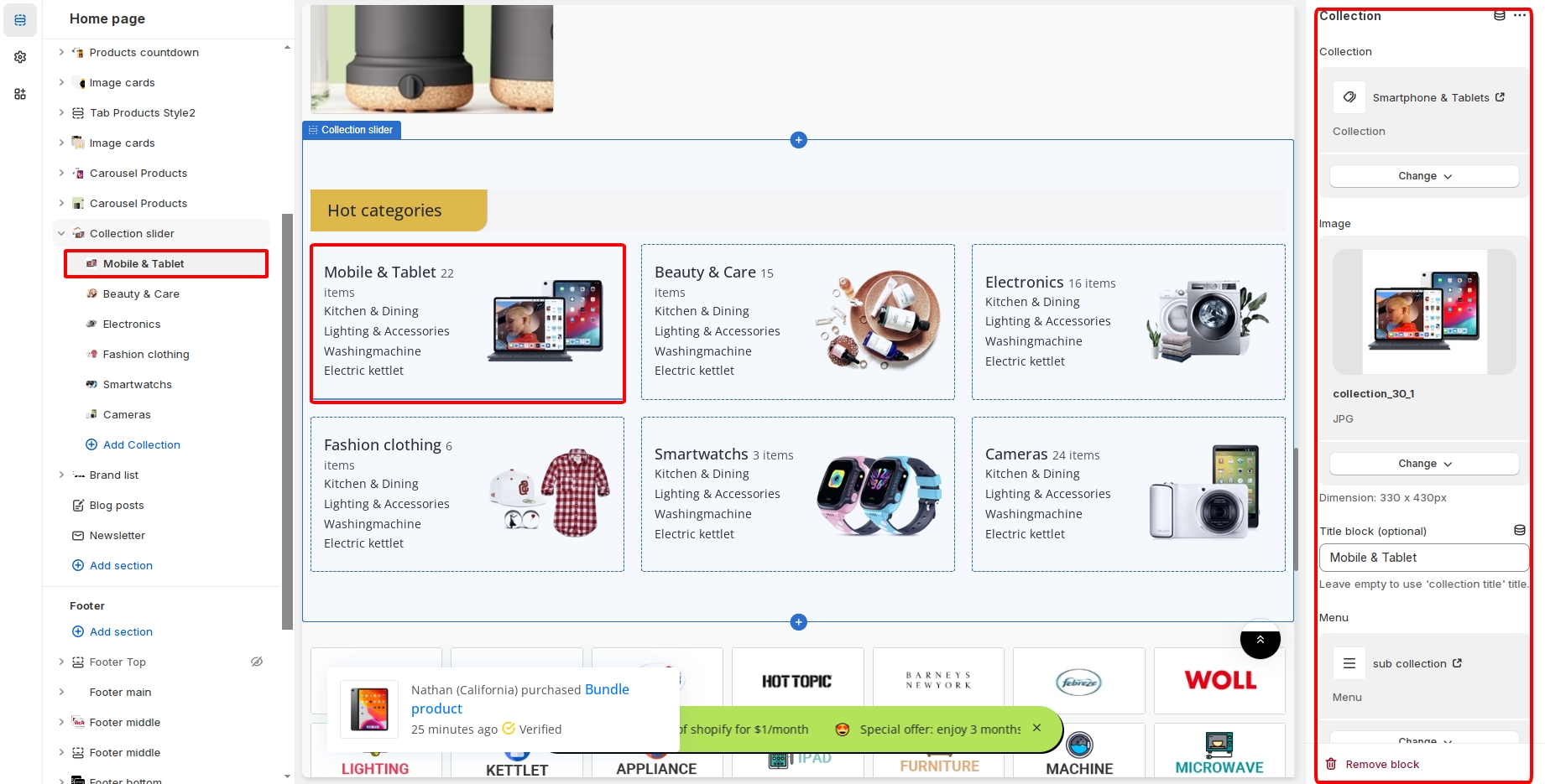 When you click on item then you can change the image, button texts and link to collection or page on the right panel