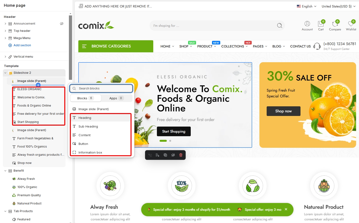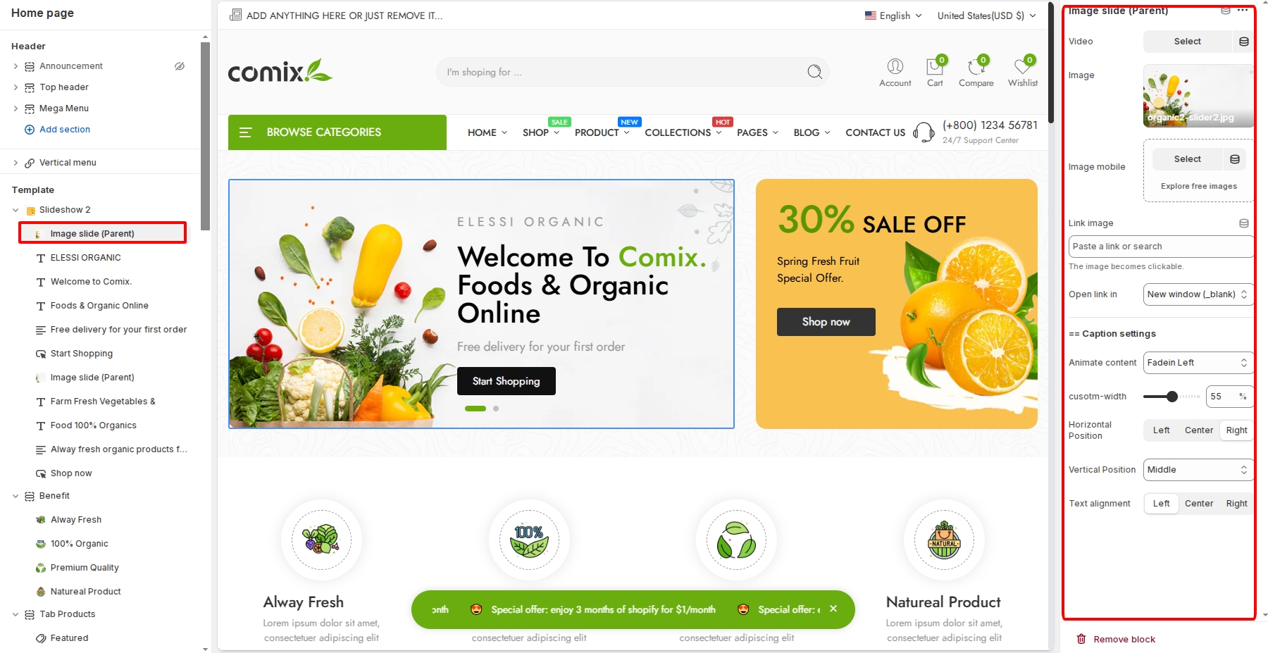 The slideshow, it is under the header and includes: Heading, Subheading, Space between and button elements. You can click on them and setting on the right panel.
