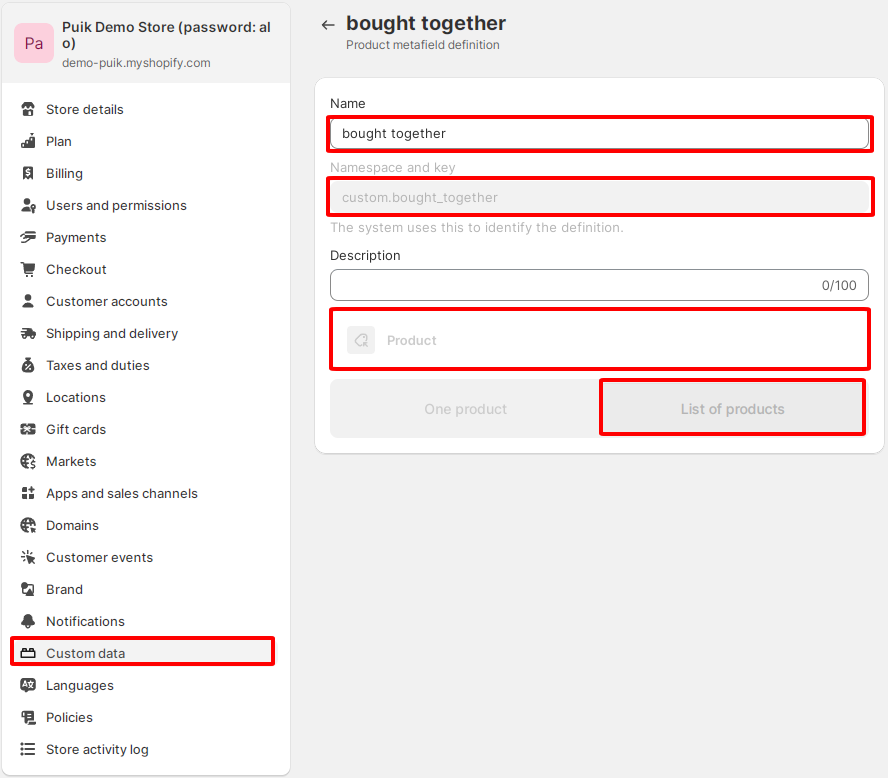 * Namespace and key: **custom.bought\_together**