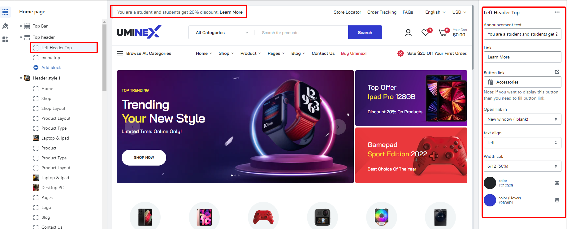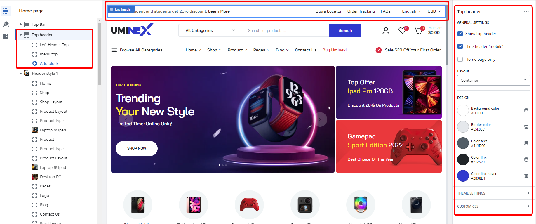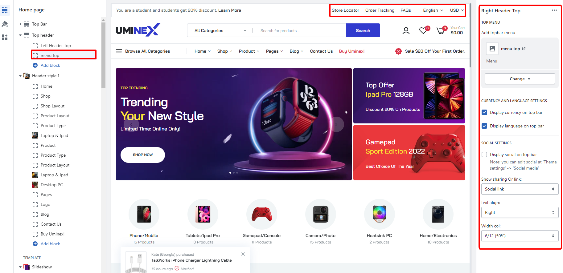 From Admin>>Theme>>Top header and setting on the right. You can Turn ON or OFF the top header, currency, language, account. Also you can change the color, background, Social settings.
